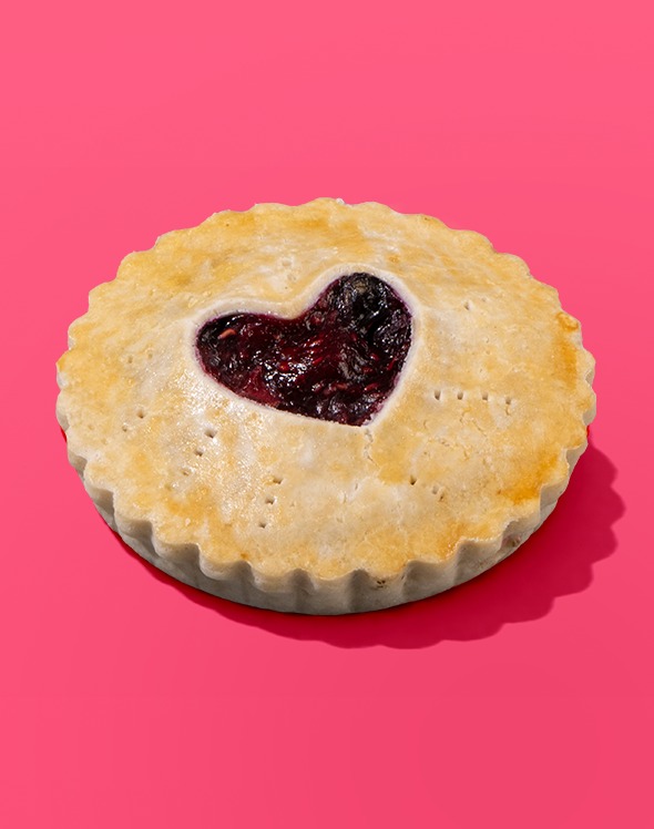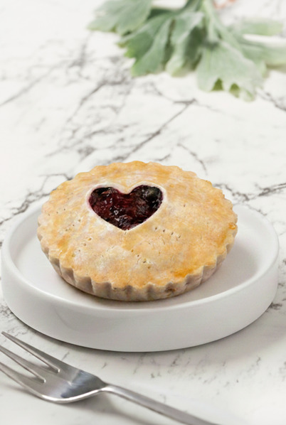 Mini pie con relleno de frutos rojos con decoración de corazón sin azúcar.